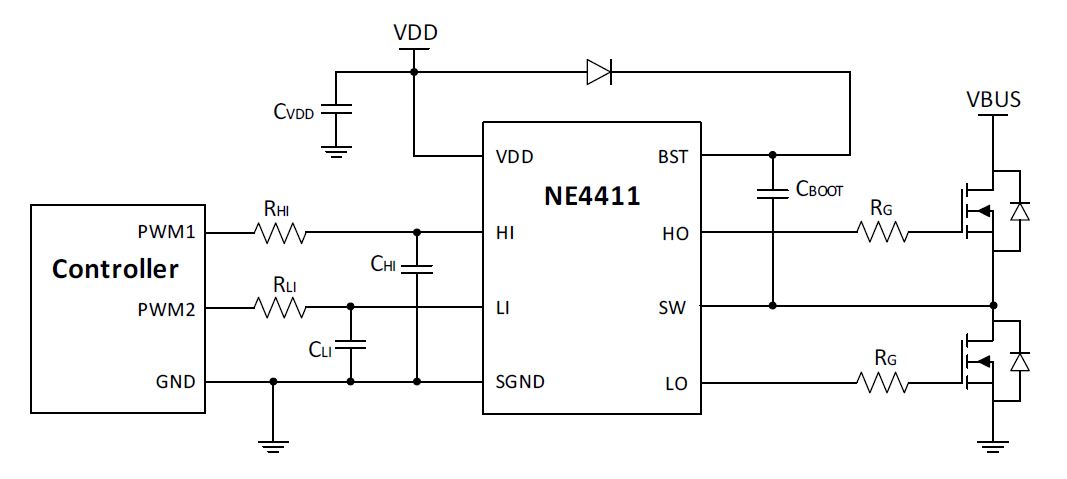 NE4411 的高邊和低邊驅動部分均能在 10V 至20V 的電源電壓下工作,并各自具有獨立的欠壓鎖定(UVLO)保護功能。NE4411 擁有兩個獨立輸入引腳(HI 和LI),兼容TTL 和CMOS 邏輯電平。