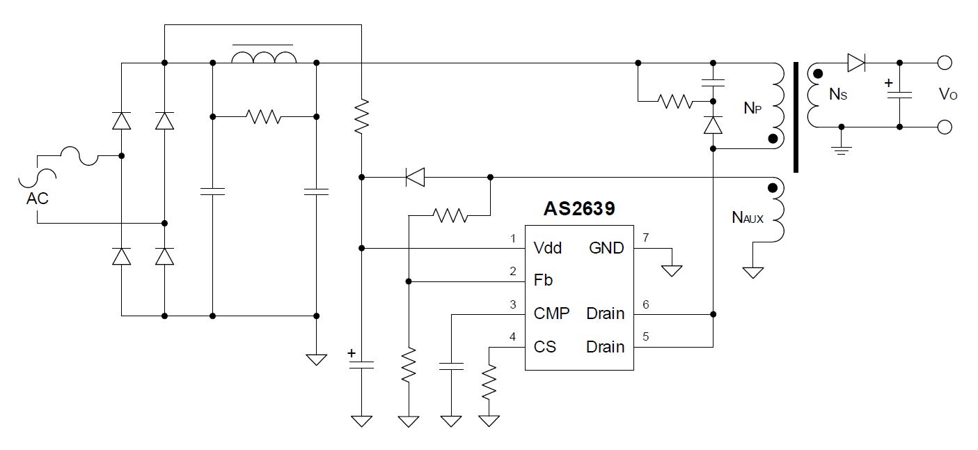 AS2639 提供全面的保護,包括開環保護、短路保護、逐周期限流保護、內置前沿消隱、電壓鎖定Vdd(UVLO)等。