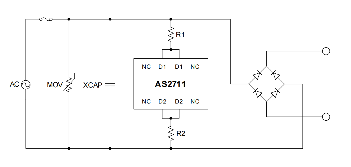使用 AS2711 設(shè)計(jì)電源時(shí),只需根據(jù)所用 X 電容值選擇合適的外部電阻值即可獲得所需的時(shí)間常數(shù)。雙端子設(shè)計(jì)兼具簡(jiǎn)單和穩(wěn)定性,滿足電源系統(tǒng)的安規(guī)標(biāo)準(zhǔn)。