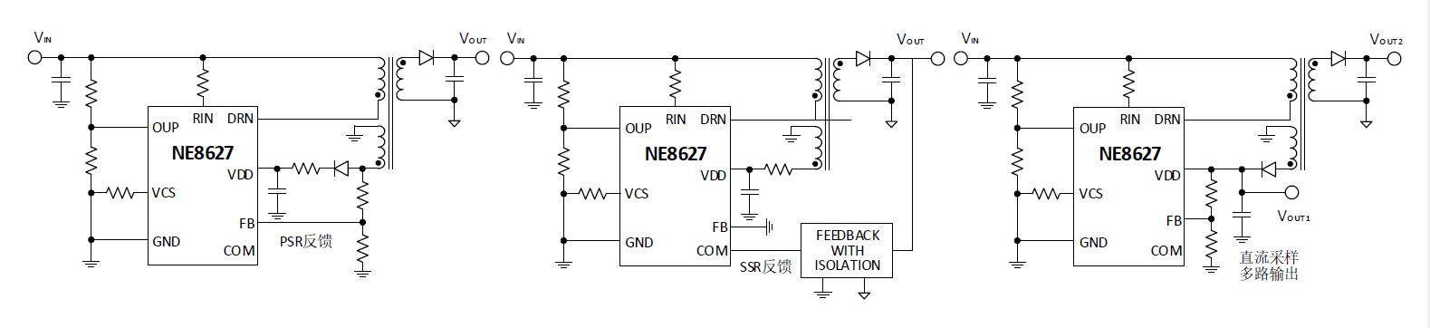 NE8627 集成過功率保護、輸出短路保護、輸出過壓保護、過溫保護等功能,在異常情況撤銷后都可實現自恢復,最大限度保證開關電源系統的可靠性。