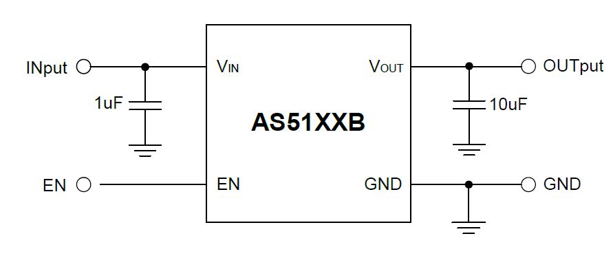 AS51XXB 系列包含八個固定輸出電壓,分別為:1.8V,2.5V,2.8V,3.0V,3.3V,3.6V, 4.0V 和 5.0V。