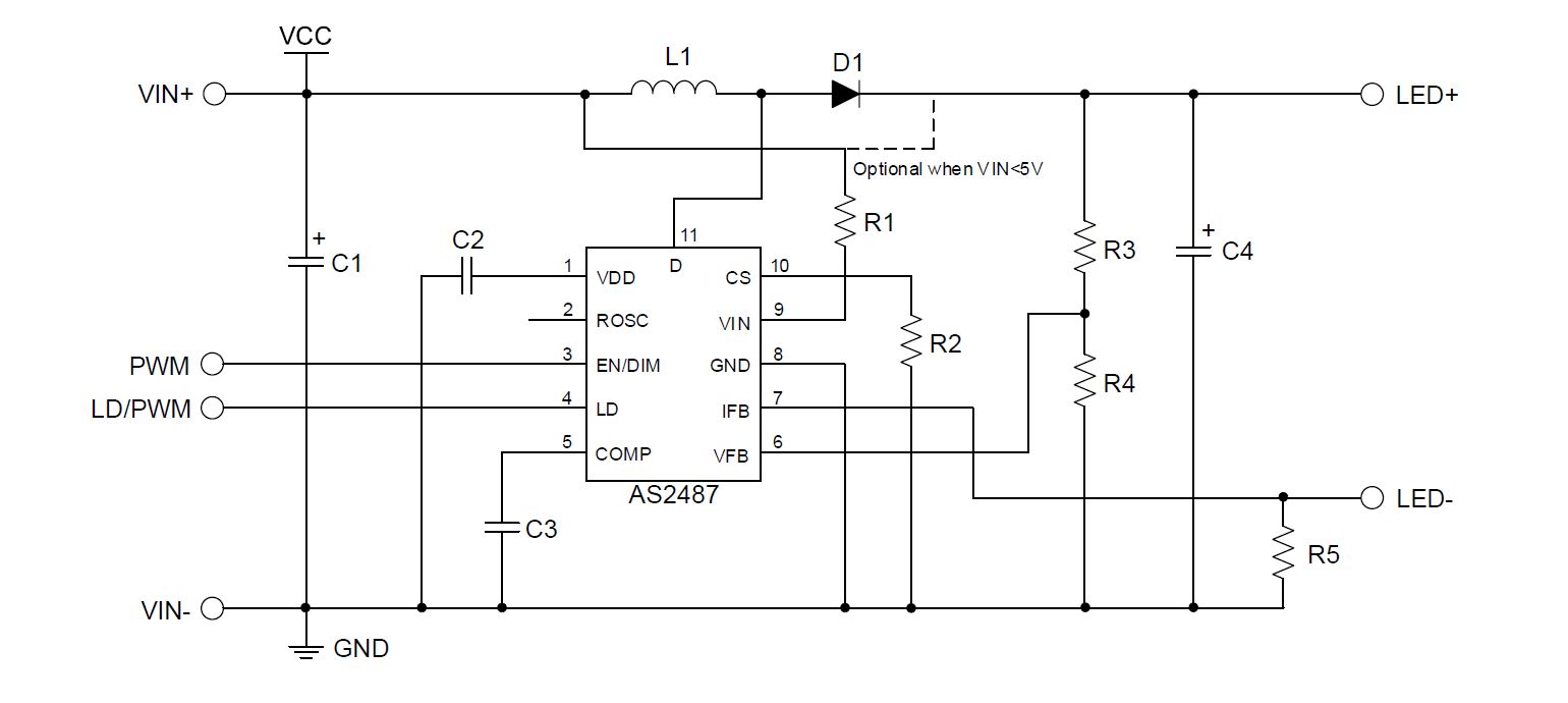 AS2487 2.7-60V輸入,內(nèi)置MOS,輸出電流1A,帶PWM和模擬調(diào)光
