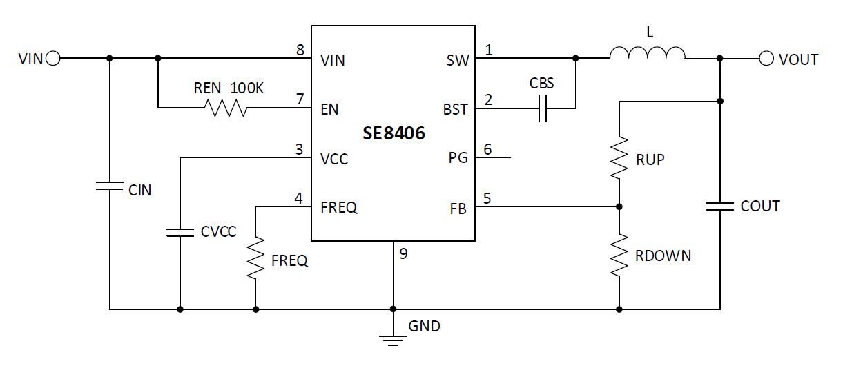 SE8406 具有低阻值 0.1Ω 高側和 0.08Ω低側功率管,可提供至少 3A 的輸出電流能力,具有出色的負載和線路瞬態響應。