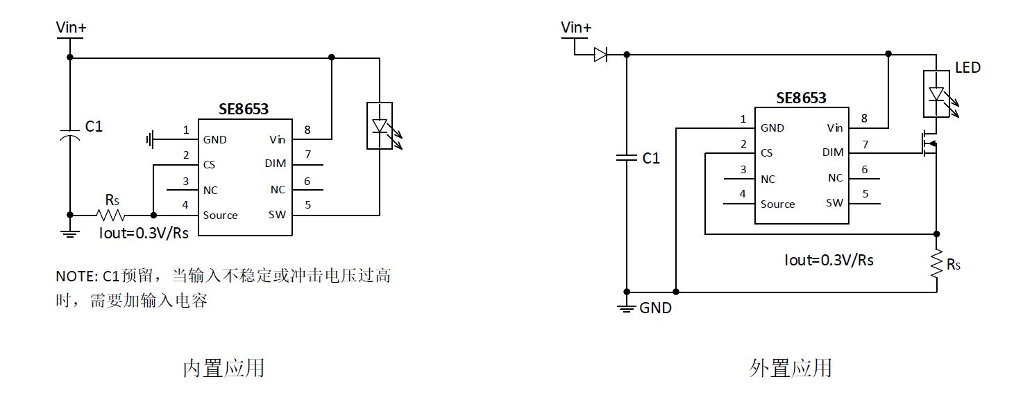SE8653 支持 PWM 調光和模擬調光,可通過 PWM 腳用 PWM 信號調節 LED 輸出電流。通過 VIN 腳可以實現模擬調光。