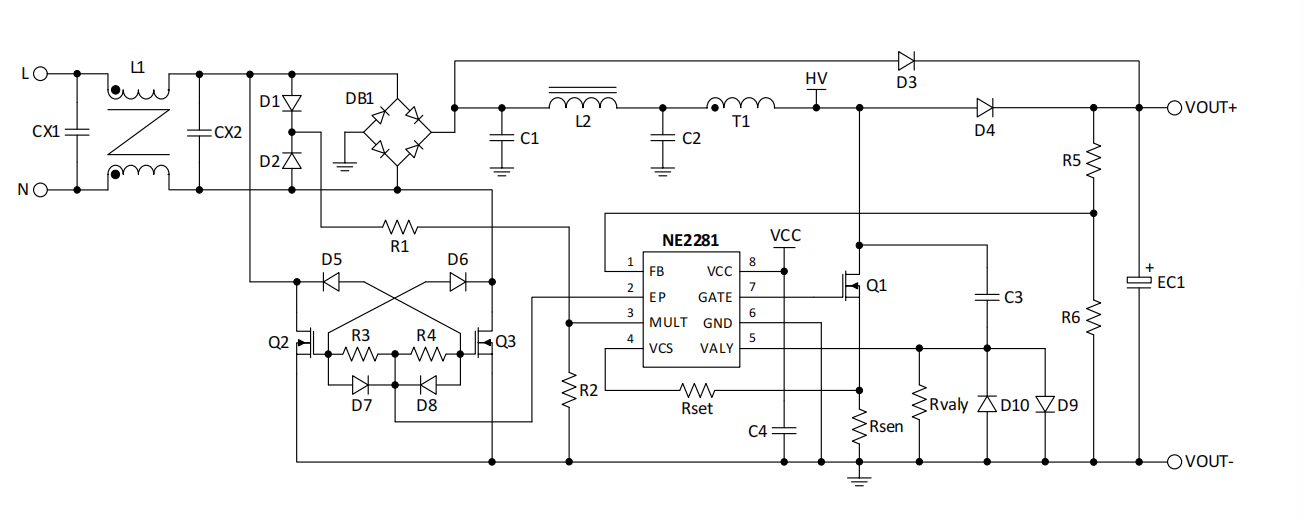 NE2281內(nèi)置CCM抖頻技術(shù),使得芯片具有良好的EMI性能。同時(shí)芯片集成了豐富的保護(hù)功能,包括:逐周期過流保護(hù)(OCP),電流采樣短路保護(hù)(SCP),過載保護(hù)(OLP),欠壓鎖定(UVLO),過溫度保護(hù)(OTP),過電壓保護(hù)(OVP)等。