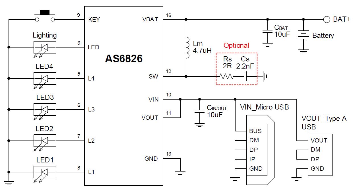 AS6826內(nèi)置同步升壓功率MOS管,無需外接肖特基二極管,可支持1A的輸出電流。其內(nèi)置的4LED電量指示燈驅(qū)動(dòng)可以顯示移動(dòng)電源剩余電量。